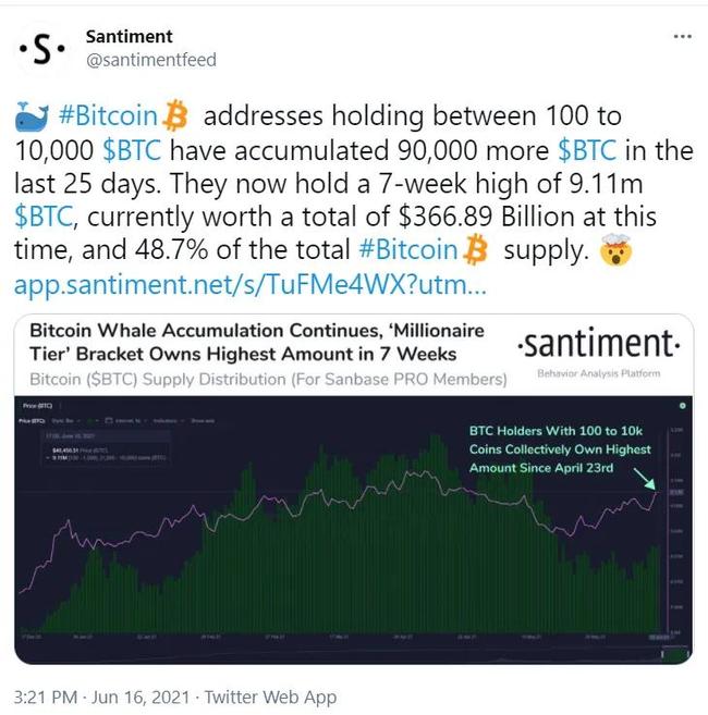 据Santiment数据显示,持有100至10,000枚BTC的地址在过去25天内又积累了90,000多枚BTC。目前,这些地共计持有911万枚BTC,达4月23日以来的7周高点,总价值为3668.9亿美元,占比特币总供应量的48.7%。